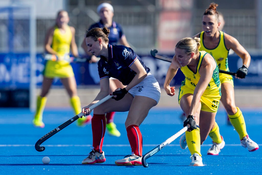 Face à un bloc australien patient, la France tente d’abord d’installer son jeu. Les « Hockeyroos » ne pressent pas immédiatement, préférant guetter l’erreur de transmission pour déclencher des contres foudroyants. Sur l’une de ces actions, l’Australie obtient un Penalty Corner (PC), mais une mauvaise réception adverse permet à la défense française de se dégager provisoirement.